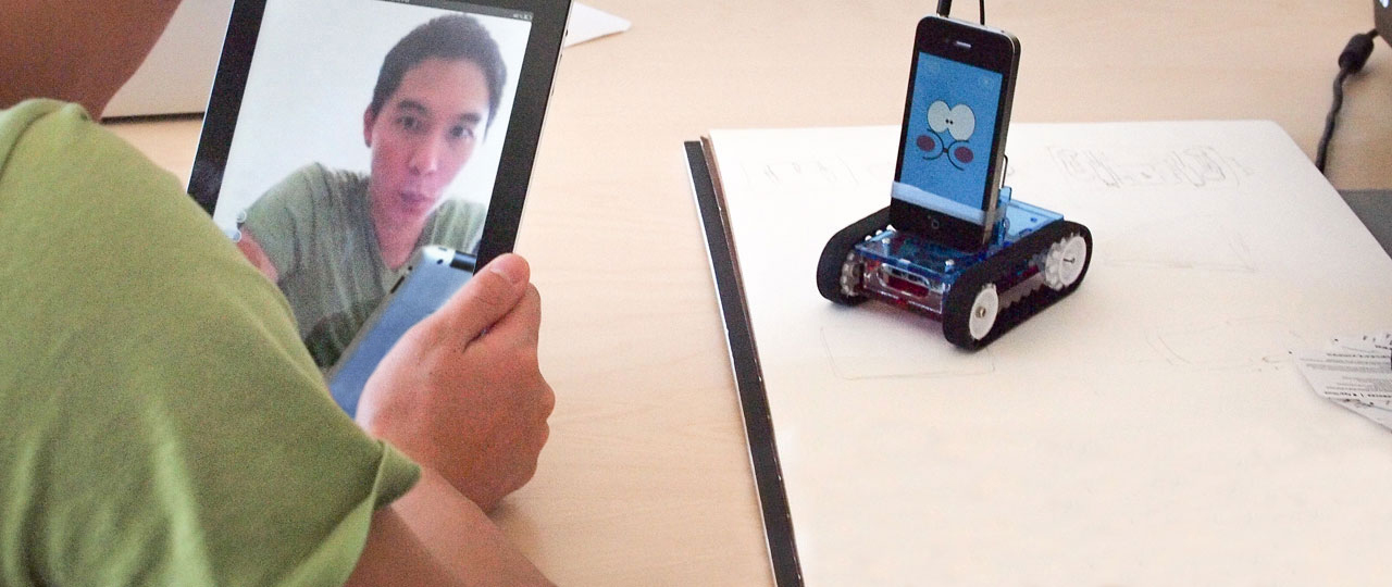 Quem possui dois aparelhos (um iPhone e um iPad, por exemplo) pode usá-los simultaneamente para operar o robô. O mais legal é que é possível projetar na tela do dispositivo utilizado como controle remoto as imagens capturadas pelo aparelho que estiver dando vida ao Romotive. As imagens abaixo mostram bem isso.