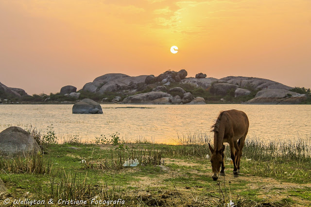 O céu ficou dourado no fim de uma tarde de janeiro, estávamos com a câmera e fomos até o Açude fazer essas fotos. A iniciativa foi da Cristiane, como sempre! O cavalinho estava lá como sempre! A água dourada tava linda! Os matinhos na água que a Cristiane adora fotografar deram um charme a mais para a cena!