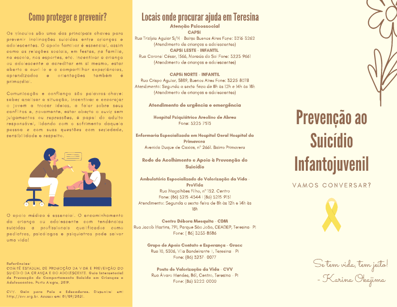 Com objetivo de levar à população ações que visam a conscientização em relação à saúde mental, e estimular o diálogo sobre suicídio infantojuvenil, o Tribunal de Justiça do Piauí (TJ-PI), por meio da Coordenadoria Estadual Judiciária da Infância e da Juventude (CEJIJ) elaborou um folder com informações de prevenção e locais de onde buscar ajuda para esse tipo de situação.